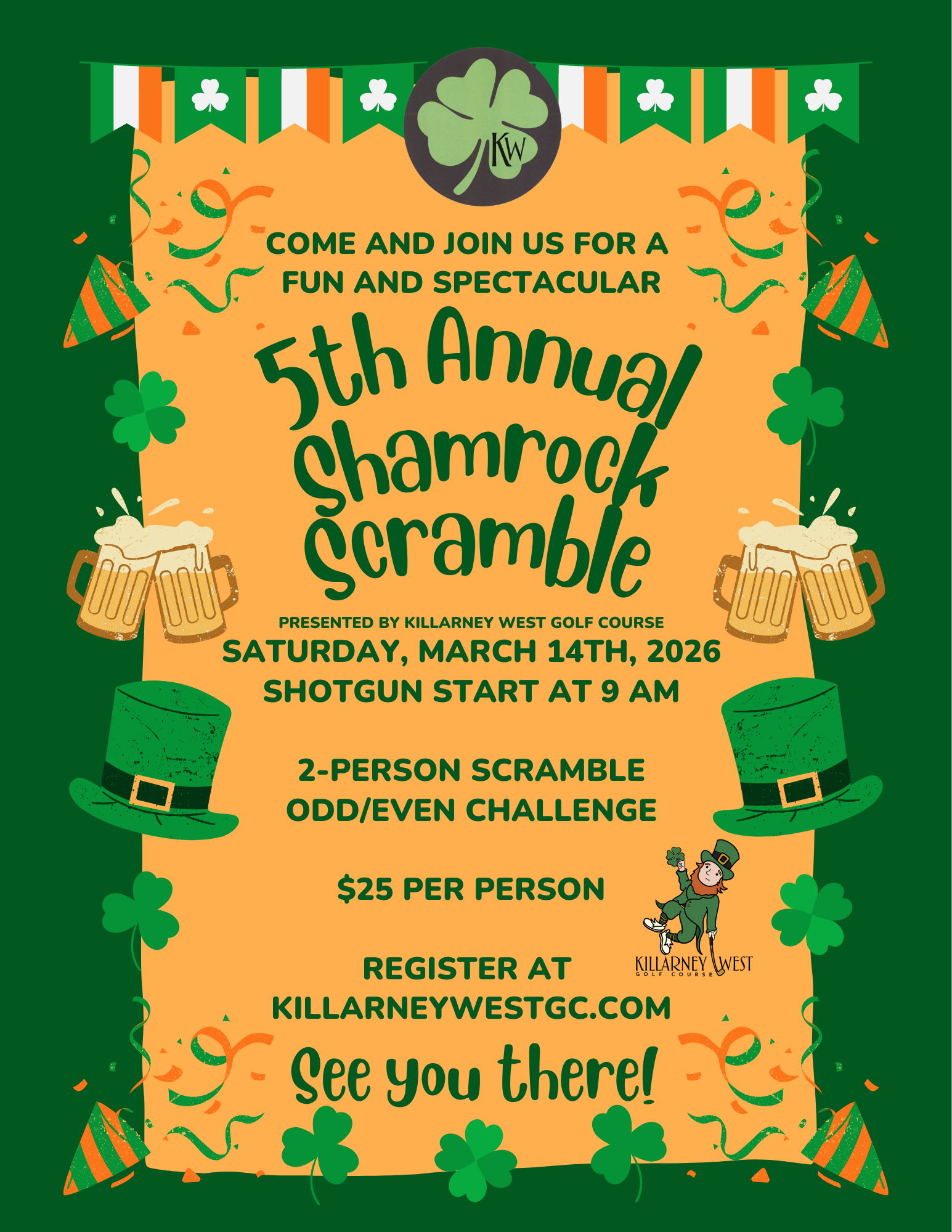 Time to bust out your Lucky Charms and bring home the gold!! Please join us to celebrate St. Patrick’s Day with our 5th Annual Shamrock Scramble!!