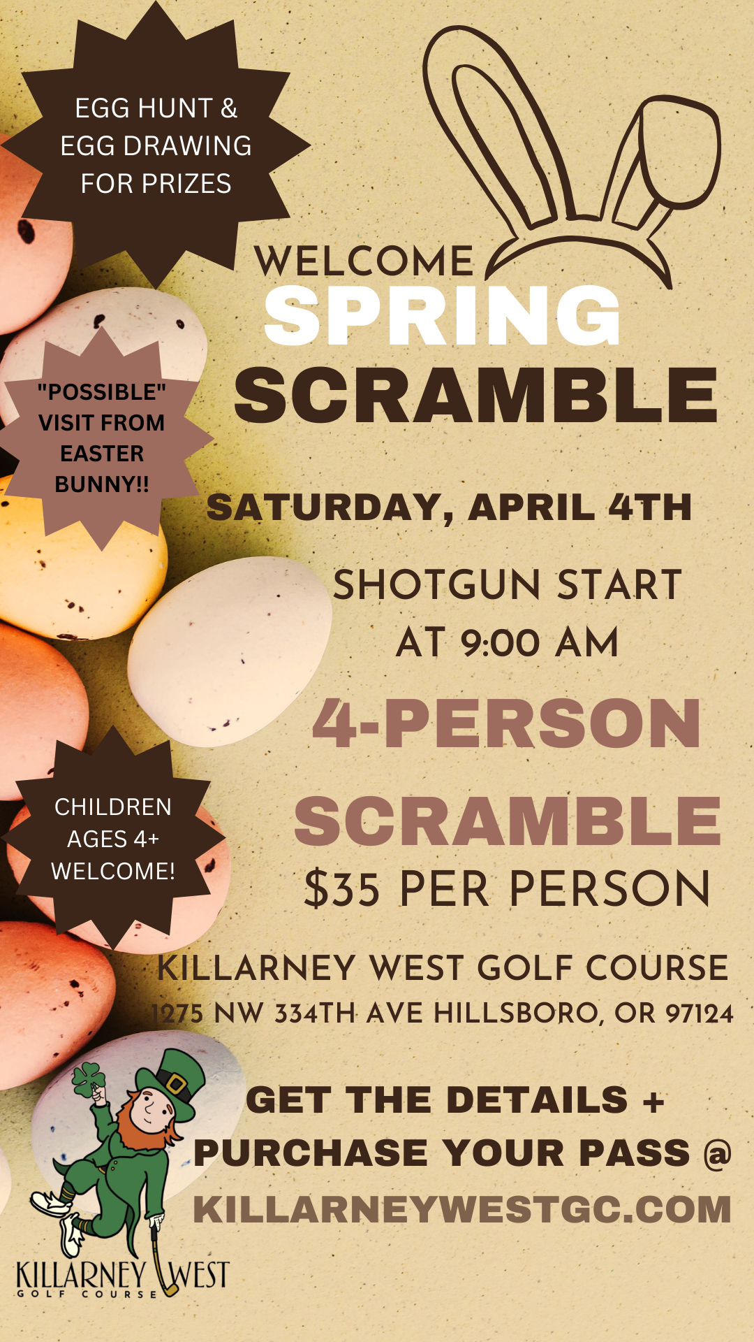 Hop into Spring and join us for our 4th Annual Welcome Spring Scramble! This tournament is so much fun and has many opportunities to win great prizes!